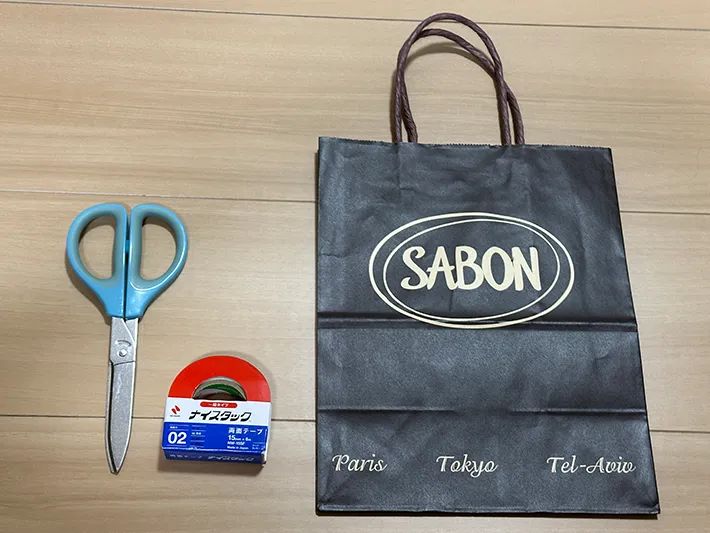 持ち運び可能な収納ボックスを作るために必要なのは、紙袋とハサミ、両面テープです。