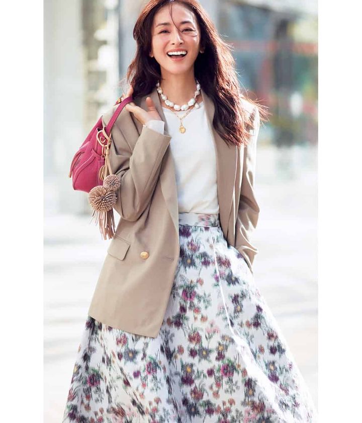 マッキントッシュ(MACKINTOSH)のジャケット×エブール(ebure)の花柄スカートが同時ランクイン。コンサバ派が大好きな甘スカートは端正なテーラードで凛としたムードをプラスして。表情が明るく見えるベージュやキャメルを選べば一段と春らしく。