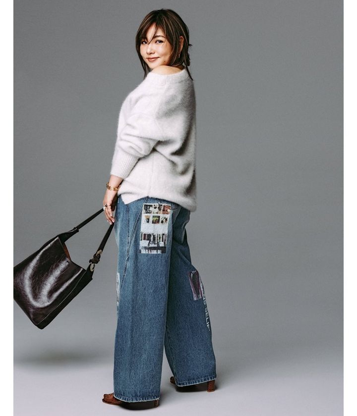 デニムパンツ¥24,200(メゾンスペシャル/メゾンスペシャル 青山店)ニット¥37,400(アルページュストーリーオリジナル)バッグ¥201,300(アニヤ・ハインドマーチ/アニヤ・ハインドマーチ ジャパン)サンダル¥29,700(ツル バイ マリコ オイカワ)靴下¥880(靴下屋/タビオ)ピアス¥38,280(フェルセラ/ZUTTOHOLIC)ブレスレット¥24,200(ワンエーアールバイウノアエレ/ウノアエレ ジャパン)ブルートパーズリング¥231,000ラリマーリング¥330,000(ともにマリハ)