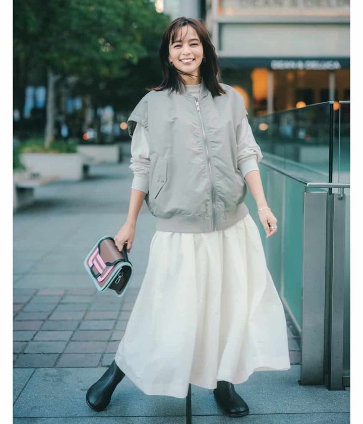 ミリタリーブルゾンの袖をカットしたデザインが新鮮なアッパーハイツ(upper hights)のベスト。甘コーデの中和に温度調節にと、春先何かと重宝する一枚。ほんのりカーキがかったベージュとオーバーサイズのラフさがフェミニンな白スカートにこなれ感をもたらして、瞬時に今っぽく!