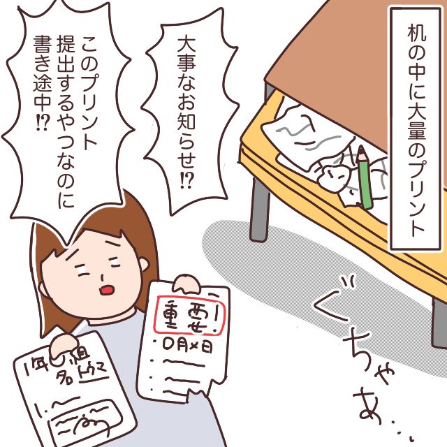 そして、机やランドセルの中に大量のプリントを溜め込むこと。それも、全部しわくちゃになった状態で・・。もらったらとりあえず机やランドセルに突っ込んでいるんでしょうね。珍しく持ち帰って渡してくれたと思ったら、かなり前の重要なお知らせだったり、提出期限が過ぎた書類だったり、ぐちゃぐちゃに何かが書かれた状態だったり・・。もらったプリントを親に渡すのってそんなに難しい!?と思ってしまいます。
