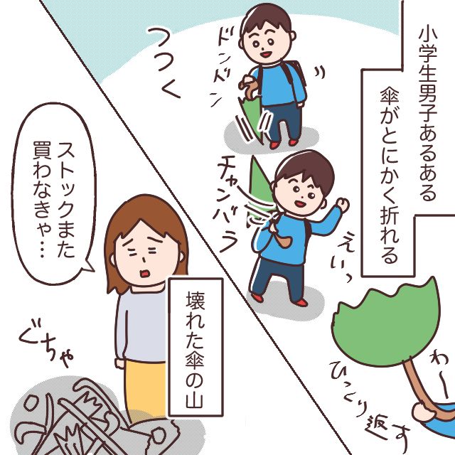 そして、小学生男子あるあるなのがコレ。とにかく傘が折れるんです。地面を突いたり掘ったり、友だちとチャンバラごっこをしたり、広げて走り回ったりしている姿が目に浮かびます。何度注意してもダメ。私は壊れた傘の山を見て「ストックまた買わなきゃ・・」とうなだれます。