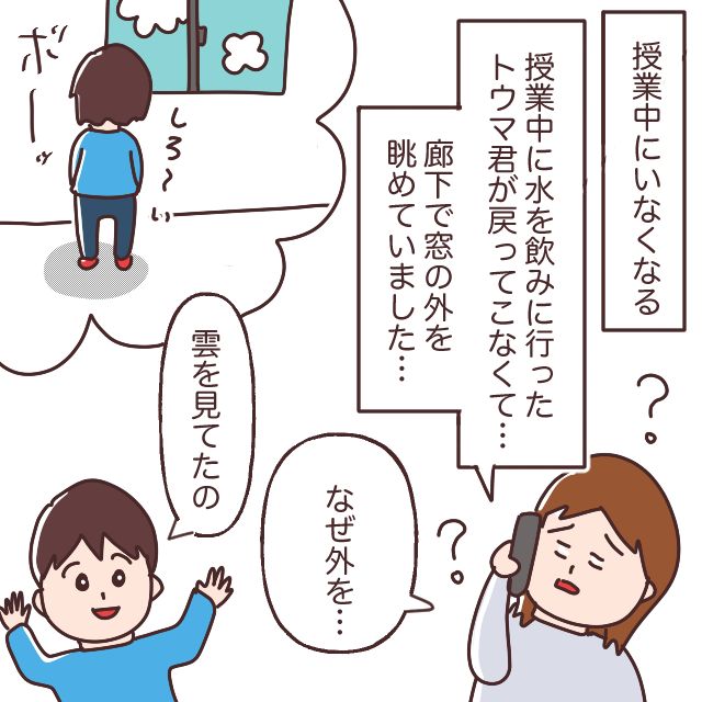 こんなこともありました。授業中に水を飲みに行った息子が戻って来ず、先生が様子を見に行くと、廊下でぼーっと窓の外を眺めていたそう。先生から電話で報告を受けた私は帰宅した息子に何をしていたのか聞いてみたところ、「雲を見てたの」とさらり。うーん・・なぜ?自分の世界に入ったらなかなか帰って来れない息子です。