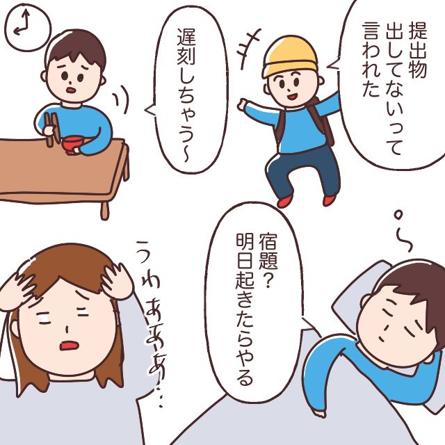 そして、息子はかなりのマイペース。忘れ物をしても「提出物出してないって言われた」とあっけらかんとしているし、「遅刻しちゃう~」と言いながらも急ぐ素振りは見えずのんびり朝食を食べ、宿題が終わっていなくても「宿題?明日起きたらやる」と平気で寝てしまう息子。肝が据わっていると言えば聞こえは良いですが、きっと彼は何も考えていないだけ。焦らない息子を見て私のほうがいつも焦っています。どうして平気なの?誰か・・小学生男子のトリセツを私にください。