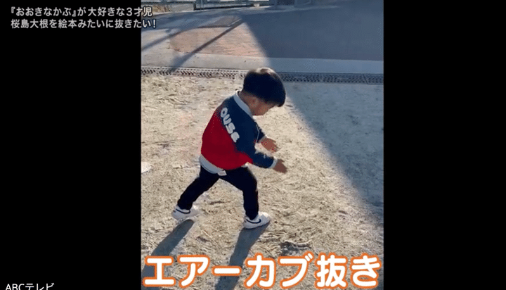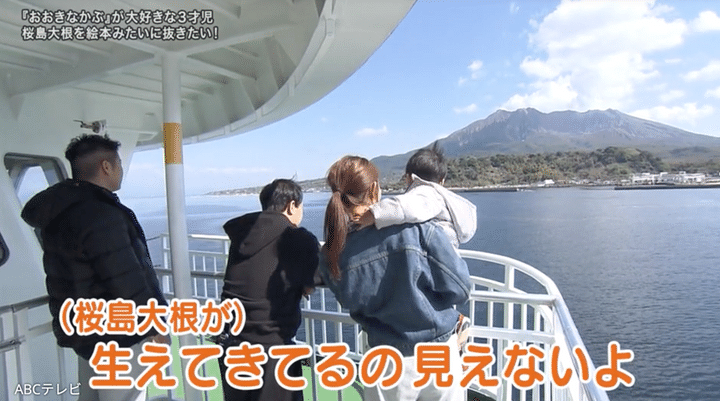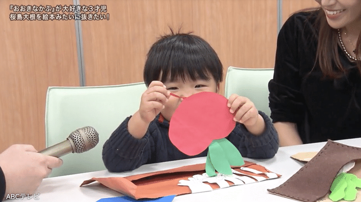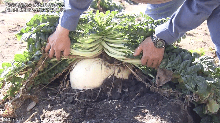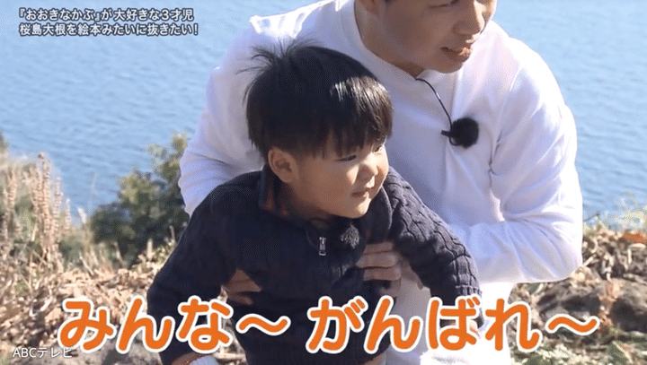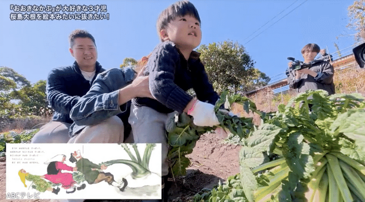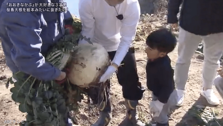 探偵!ナイトスクープ』(ABCテレビ)に、愛知県在住の女性(35)から3歳の息子に関する依頼が届く。絵本の「おおきなかぶ」を読み聞かせて以来、3歳児はカブにどハマり! 寝ても覚めても「カブ! カブ!」と言っている。鹿児島の名産品である巨大な「桜島大根」の存在を知った3歳児は、「桜島大根=おおきなかぶ」と認識するように。絵本のように、みんなと力を合わせて桜島大根を引き抜きたい。息子のそんな願いを叶えてほしいというのが依頼内容だ。
