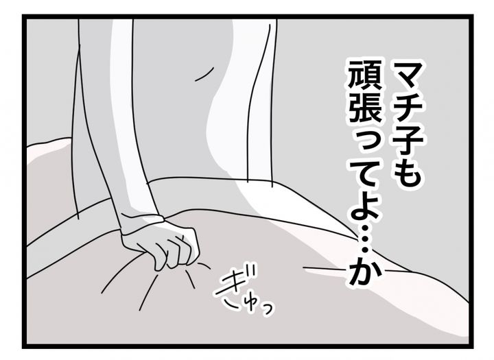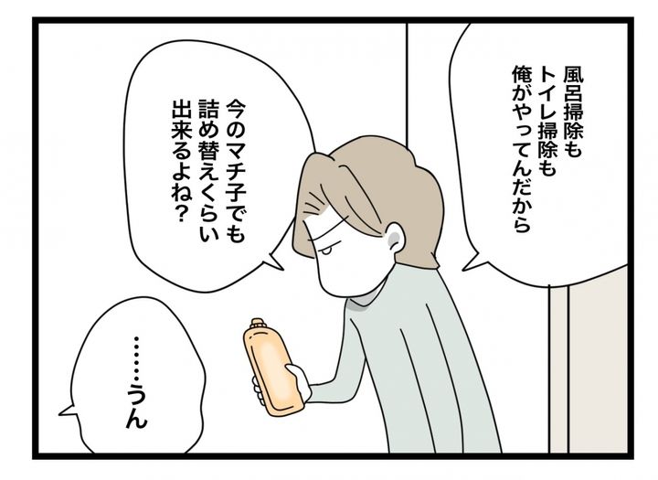 ツムママさんが複数の人の実体験をギュッと凝縮しフィクションとして描いた『半分夫』。横になっているマチ子にわざわざ声を掛け、洗剤の補充をしろと小言を言うブン太。「それくらいやってよ」は通用しない。家事は絶対に半分にしなきゃ気が済まないのだ。そして現状「俺ばかり割を食っている」と不満をあらわにする。