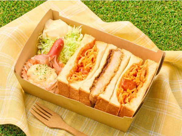 「全国ご当地グルメコート 大宮横丁」×「ブランジェ浅野屋」のコラボレーション。 耳までおいしいホワイトブレッドでサンドした「ナポリタンサンド」や「とんかつサンド」のほか、添えられたタコさんウィンナーがランチボックスをレトロに彩ります。