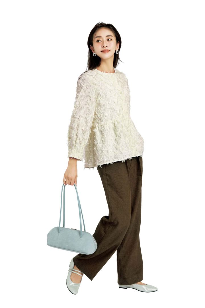 トップス¥17,930(DAY by DAY It’s international)バッグ¥18,700(アドカラム/アンソロジー)シューズ¥26,400(銀座かねまつ/銀座かねまつ6丁目本店)ピアス¥17,600(ワンエーアールバイウノアエレ/ウノアエレ ジャパン)パンツ/スタイリスト私物