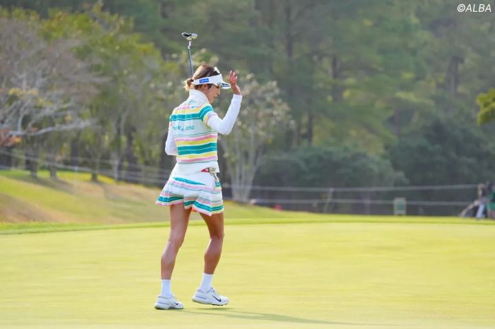 女子プロゴルファーの“おしゃれ番長”といえば金田久美子プロ。この日もグリーン、イエロー、ピンクといった春らしい配色のマルチボーダー柄のセットアップでファンを魅了していました。