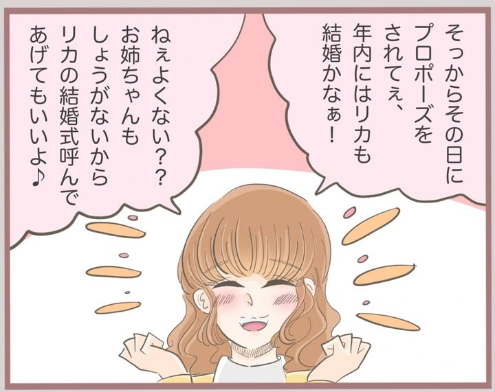 ゆいには一つ年下のフランス人形のように美形の妹リカがいて…。リカは彼の奥さんを訪れて「彼と別れて」と言うらしい。ゆいに「用心棒としてついてきて」と頼むが、結婚を控えるゆいは巻き込まれるわけにはいかないし、何といっても非常識な考えのリカに賛成できず拒否した。