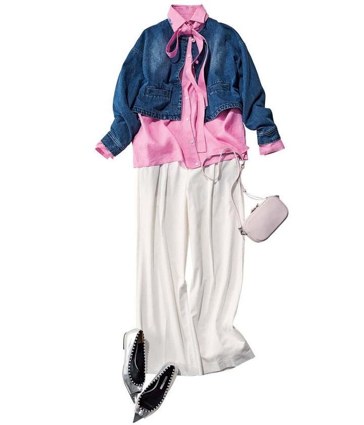 デニムジャケット¥39,600(アルアバイル)ピンクボウタイブラウス¥31,900(ル フィル/ル フィル ニュウマン新宿店)ホワイトパンツ¥25,300(エーケー ワン/ビームス ハウス 丸の内)ピンクバッグ¥55,000(土屋鞄/土屋鞄製造所)シルバーオープントウパンプス¥40,700(ピッピシック/ベイジュ)
