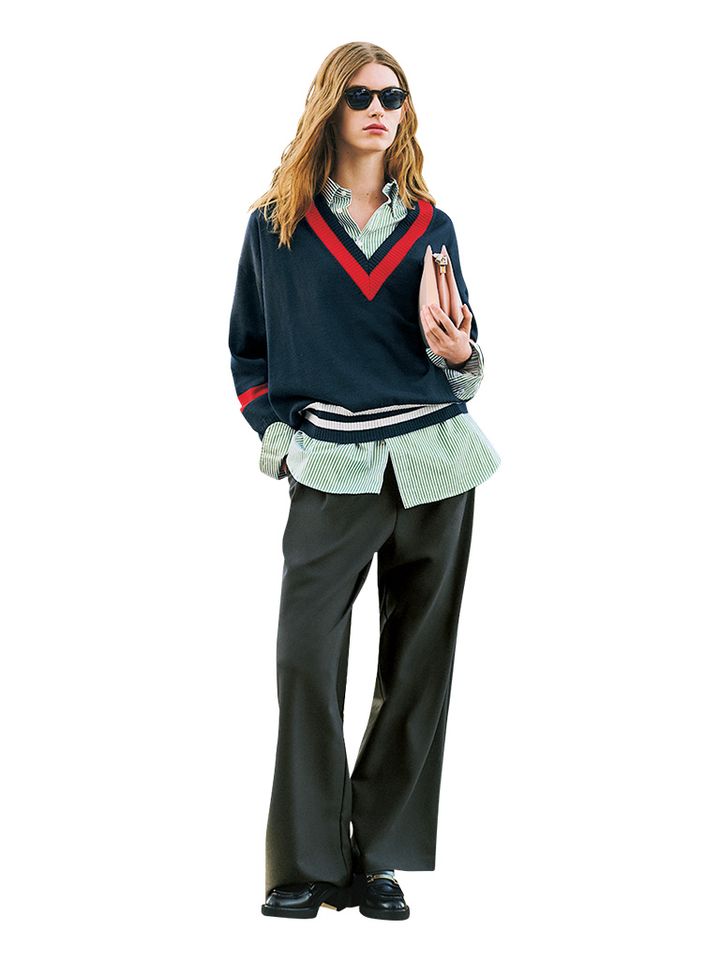 カレッジ風のチルデンニットをトラッドなネイビー×赤配色で。シャープな首まわりに沿う、赤ラインとのダブルVでメリハリよく。身ごろやスリーブのボリューム感をすそリブでしぼり、気だるくキレイなドレープ感を創出。ウォッシャブル仕様も嬉しいポイント。