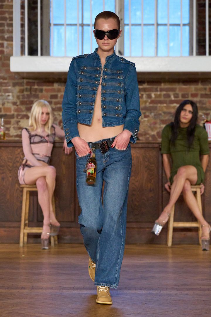 白のナポレオンジャケットを、ローライズのデニムパンツでほどよくカジュアルダウン。ブラトップによる肌見せが、軍服由来の重厚ムードを軽やかに中和してくれる。