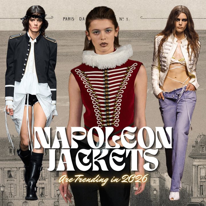 2025年頃からじわじわと注目を集め、SNSで存在感を増しつつあるナポレオンジャケット(ミリタリージャケット)。2026春夏、2026-27秋冬コレクションのランウェイにも度々登場し、本格的にトレンド入り。びっしりと並ぶボタンやループ状の装飾コード、エポーレット(肩章)など、軍服をモチーフにしたデザインが話題に。