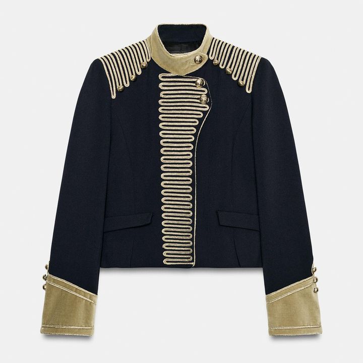 ダークネイビーのコンパクトジャケットに、ゴールドのコード装飾を大胆に添えて。襟と袖口にあしらわれたベルベット生地のトリムが、高貴なムードを加速させる。