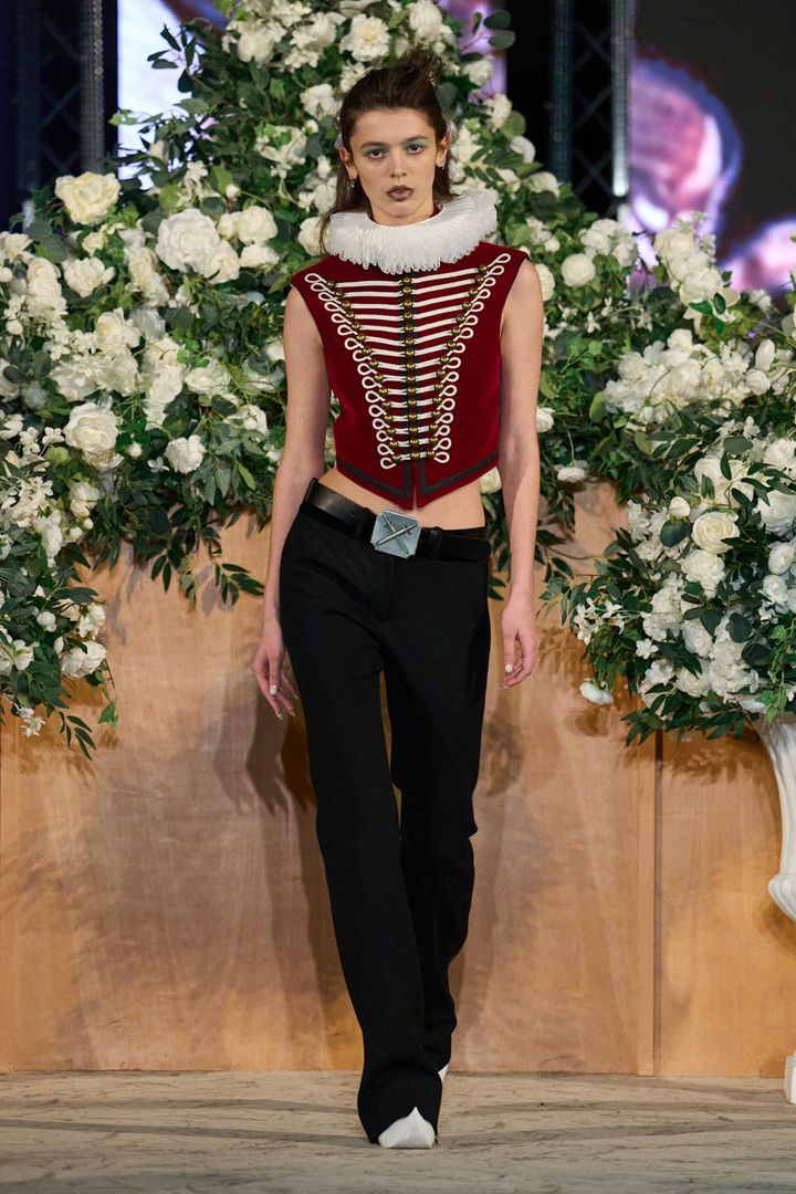 ナポレオンジャケットをドラマティックに再解釈した新感覚ベストもお目見え。深紅のボディにラッフルカラーがよく映える。リズミカルに整列したボタンに視線集中。