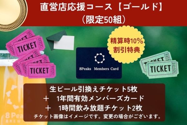 「直営店応援コース【ゴールド】」 新店舗「8Peaks ALE STAND」をしっかり楽しみたい人に向けたコース。生ビール(レギュラーサイズ)引換チケット5枚に加え、精算時10%割引特典付きの8Peaksメンバーズカード、1時間飲み放題チケット2枚がセットになっています。メンバーズカードは1年間有効で、支援者本人に加え同伴者も対象。エールスタンドでのビール利用時に使える特典です。