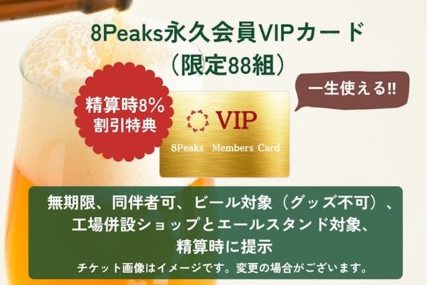 「8Peaks永久会員VIPカード」 精算時8%割引特典が無期限で適用される、限定88組の特別リターン。工場併設ショップとエールスタンドの両店舗で利用可能で、支援者本人と同伴者が対象。継続的に8Peaks BREWINGを応援したい人に向けた象徴的な会員カードです。