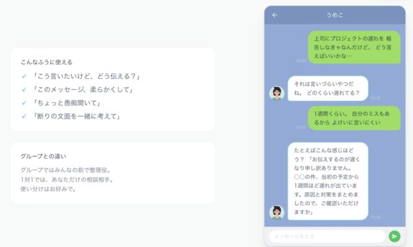 そんなときに「うめこ」は、言い方をやわらかく整えたり、長くなった話を整理したり、気まずくなりそうなやりとりの流れを落ち着いて見直したりすることで、関係を壊さずに伝えるためのサポートを行います。