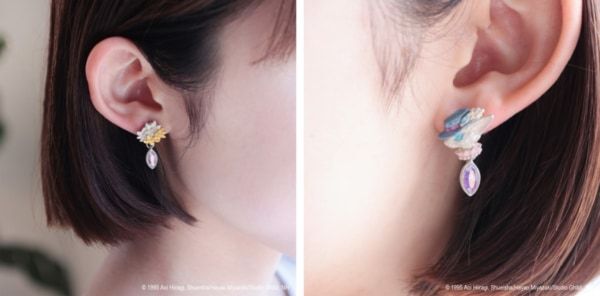 二つのピアスを組み合わせて使用すると、作中では叶わなかった二人の再会を表現するかのようにバロンとルイーゼが向かい合うデザインになっています。また、お花のピアスは単体でも楽しめるよう華やかに仕上げました。