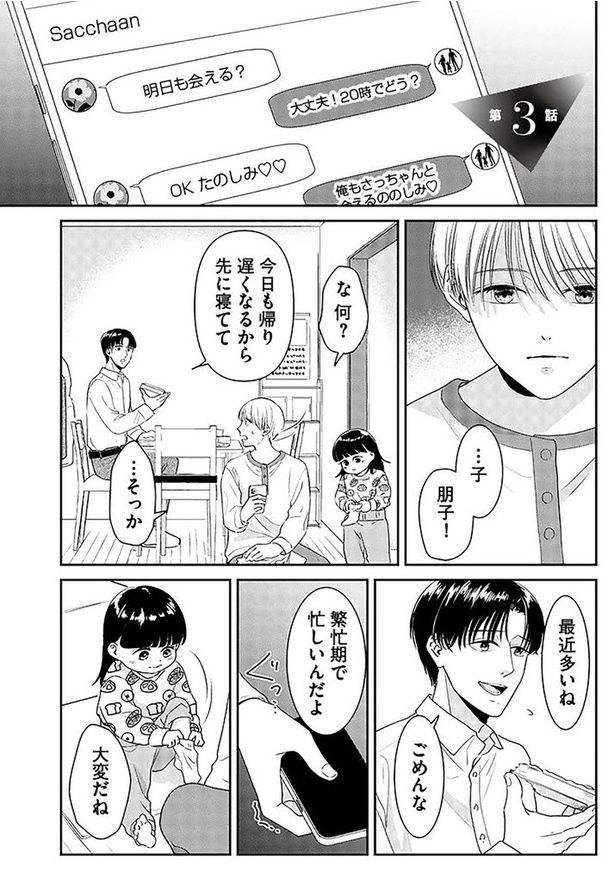 朋子は夫の聡太と娘の笑里と、平凡ながら幸せな日々を送っていた。そんなある日、聡太の「シカクリームでも使えば?」という言葉に違和感を覚える。女性用化粧品のことなんて、無頓着な夫は知らないはず。怪しんだ朋子が聡太のスマホを見てみると、そこには浮気相手との衝撃的なやりとりが…。SNS切り抜き動画で総再生回数4億回超! ショートドラマ配信アプリ「BUMP」で大ヒットし、TikTokやXで話題になったサレ妻ドラマをコミカライズした『今日も浮つく、あなたは燃える サレ妻が不倫現場に凸る話』。ご好評につき再掲載でお届けします。
