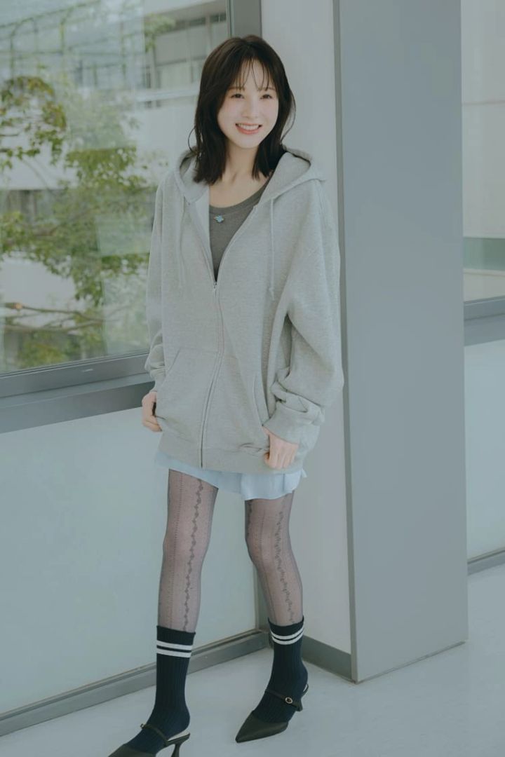 レースタイツの透け感&シンプルなフーディで、女子ウケも男子ウケもカバーできる。狙いすぎてないこなれ感が、初対面の好印象に♡