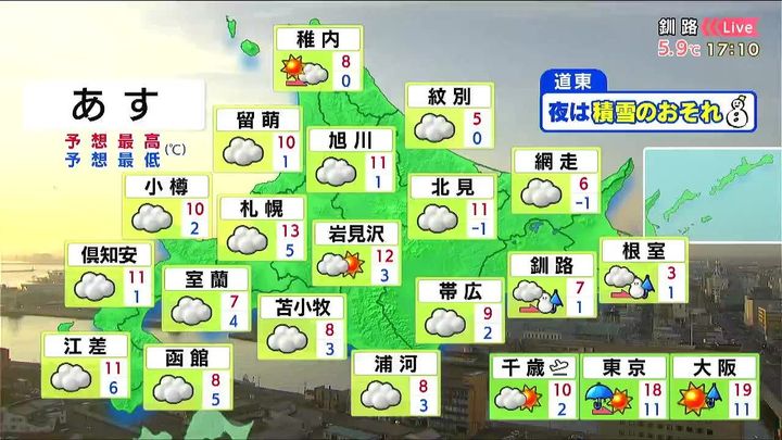 この日ざしと上空の暖気の影響できょう1日(水)の最高気温は今年最高の13.2度。釧路としてはなんと5月下旬並みでした。嘘のような本当の話です。ただ、あす2日(木)夜はうっすら雪の積もるおそれがあります。