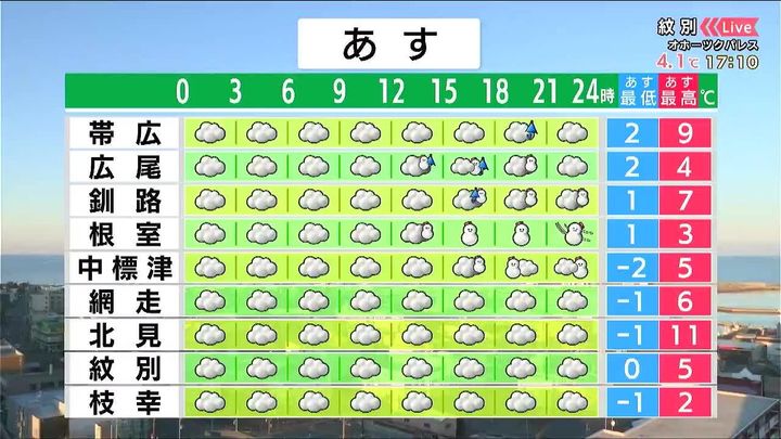 雲が広がり、午後は道東の海岸部で雪や雨が降るでしょう。最高気温は太平洋側できょう1日(水)より低く、根室は3度の予想です。日本海側はあす2日(木)も広く二桁でしょう。