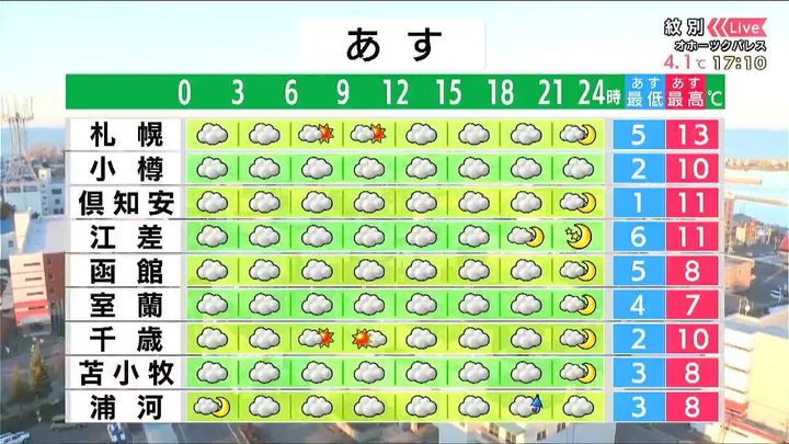 曇り空ですが、気温は上がり、最高気温は6日連続で10度を超えそうです。札幌で寒くなったり、雪が降ったりすることはありません。