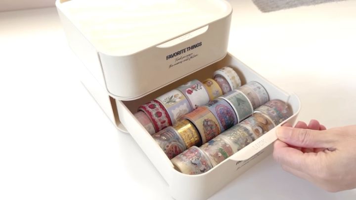 引き出しを開けたときに落ちないよう、ストッパーがついているのもうれしいポイント♪パッケージから出した折り紙がシンデレラフィットするサイズ感だそうですよ♡太めのマスキングテープも大量に収納できます。