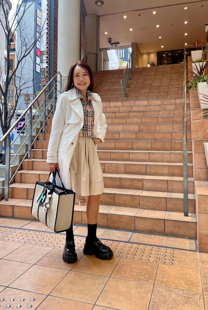 「『バーバリー』のセットアップに、セレクトショップで見つけたクリーンな白のトレンチコートを合わせて春らしく爽やかにしました。『バーバリー』はアイテムや素材次第でカジュアルにもエレガントにも表情を変えてくれるのが魅力で好きなブランド。このセットアップは着心地も良く、大人カジュアルを引き立ててくれます」