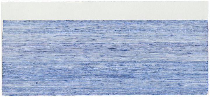 このシリーズのなかで、心にしみる青色の線は、人生の相棒であり大往生を遂げたルーディの血清から作ったインクを使いました。まさに永遠への憧れと祈りが込められ、大切な誰かを送り、いまもともにあると感じる人々の心と結ばれてゆくような作品です。