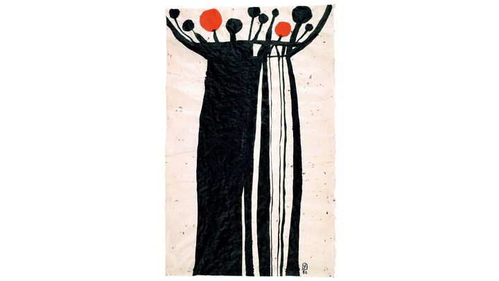 ブルックリンの展覧会のために描いた「墨と朱」シリーズ最初の作品。一時帰国中、日本の色や画材を新鮮に感じたことから生まれた。