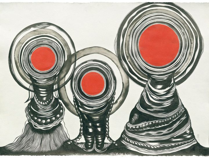 「Sumi and Shu」はNYのアートストアにある画材と比べ、墨と朱墨が新鮮に思えて2000年に始まった代表的シリーズ。日本的でありながら、描けば描くほど、日本とは離れた土地の人々が自分たちの背景と重なり合わせて見える不思議さ。ユリさんは、人間が土着的な感覚でつながっていることを感じ、“人間はひとつなんだ”という希望をもって描き続けます。