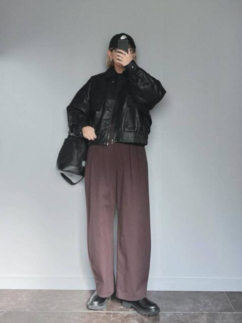 こちらも先ほどの白キャップ×白トップスと同様に、キャップとトップスの色を揃えた着こなし。黒キャップ×黒アウターというように、上半身に黒を置くとコーデにエッジが加わります。カジュアルな服装を引き締めて見せたいときにも、この色合わせは効果的です。