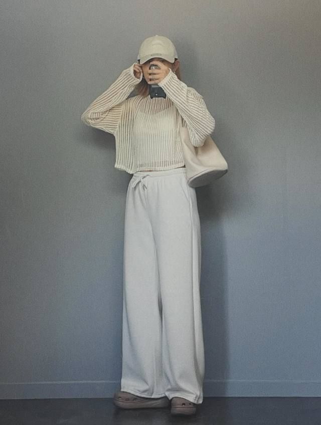 スタイリングをすべて白でまとめたときに白キャップをプラスすれば、ホワイトコーデのクリーンな雰囲気がいっそう際立ちます。装いに溶け込みながら、さりげないアクセントにもなるのが白キャップの魅力です。