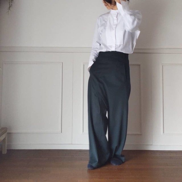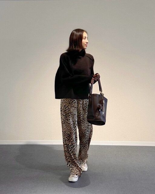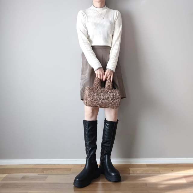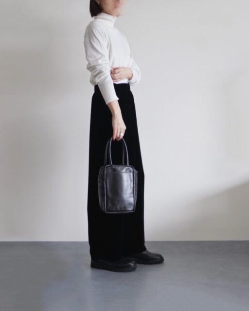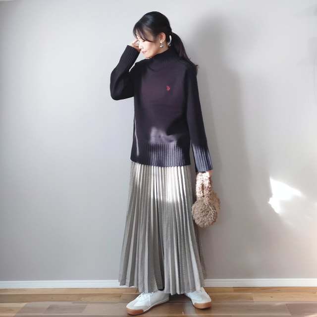筒状の長いタートルネックは折り返して着るのが一般的ですが、そのままクシュクシュたるませて着ても素敵。