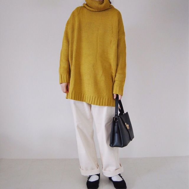 ゆとりのあるタートルネックはボリューミーかつリラクシーなムードたっぷり。肌離れがいいため「タートルネックは首がチクチクする」という方も着やすいですよ。