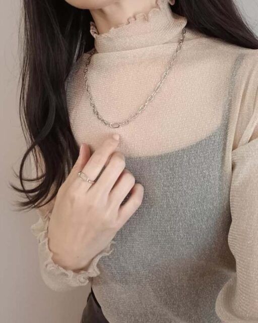 薄手のトップスでよく見られるスナップのようなハイネックは「メロウハイネック」。巻きロックを施したメロウ加工がひらひらとウェーブ状のネックラインを作り、装飾性たっぷり。シアートップスやシアーニットのデザインとして人気を集めています。