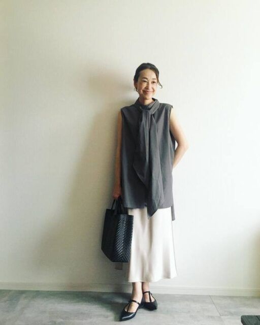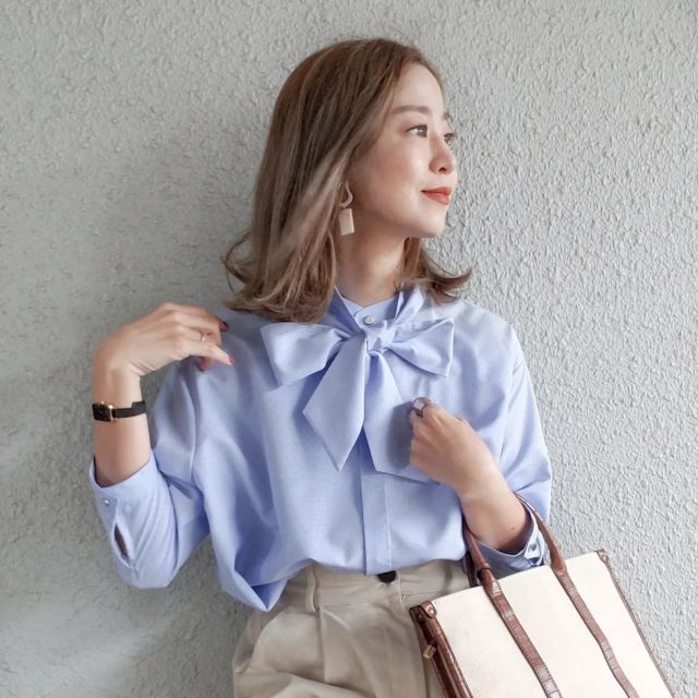 華やかに見せたいときにおすすめなのが、首元にリボン状の布が付いた「ボウタイ」。リボン結びやひとつ結びすることで首がさりげなく隠れますよ。フォーマル感がありエレガントな装いに。