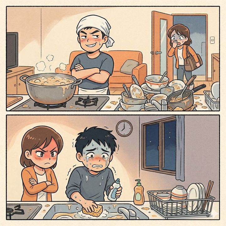 結局、夫はラーメンをすする暇もなく、深夜までキッチンの大掃除と部屋の換気に追われるハメに。