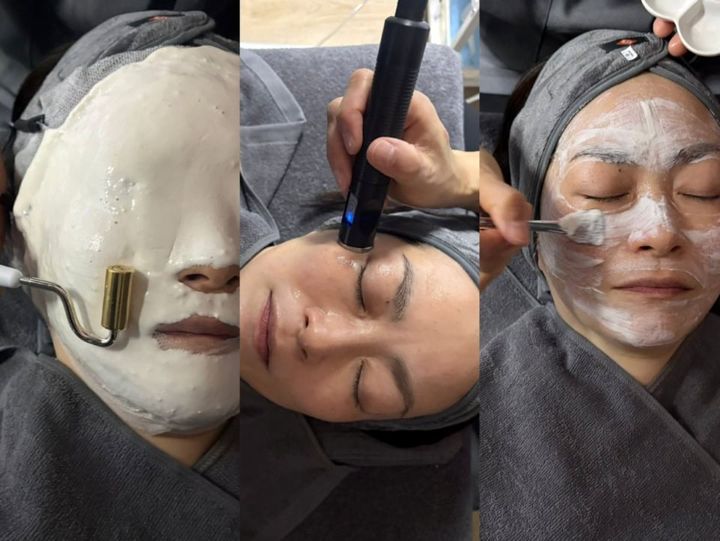 今回、私が受けたメニューは「エッセンシャル エイジングケア」(120分)¥27,450。写真右から:ミネラルオイルベースのプレクレンザーやカオリン(クレイ)を配合したパックを塗布し、皮膚表面の余分な皮脂や毛穴につまった汚れまで除去。中央:エイジングケアに欠かせない、高濃度ペプチドを「ソノイオントリートメント」(エンビロンオリジナルの超音波・イオンの組み合わせ)で導入。左:クーリングパックを使いながらイオン導入し、皮膚を整えながら、ビタミンAとCを補給。施術後は肌のトーンが爆上がりでした!