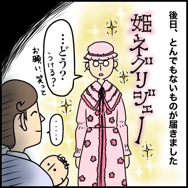 後日、義母から私宛にとんでもないものが届きました。それは、丁寧なフリルがあしらわれた、なんともお上品なシルク素材の姫ネグリジェ。しかもご丁寧にナイトキャップ付きです。「・・・どう?うける?」と夫に聞いてみましたが、返ってきたのは満面の笑みだけ。お願い笑って。笑ってくれたら救われるから。