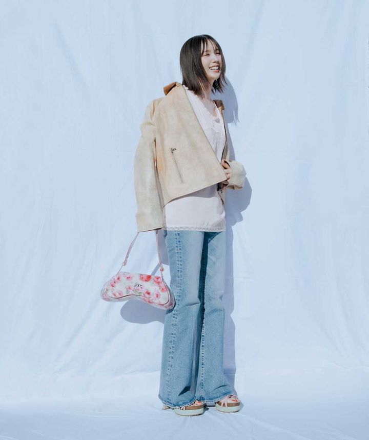 本田翼。ar3月号より フレアデニム¥18,480/マウジー(バロックジャパン リミテッド) ミニワンピース¥19,800/ザヴァージンズ レザージャケット¥172,700、バッグ¥55,000、 サンダル¥69,300/ディーゼル(ディーゼル ジャパン)