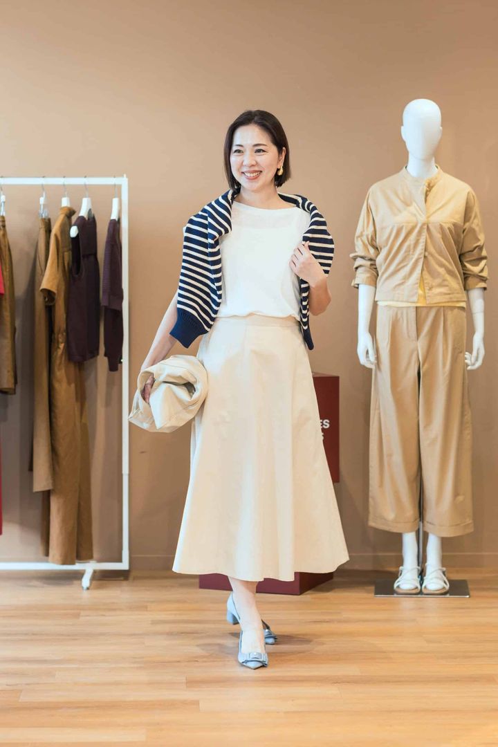 「春は爽やかなホワイトコーデで家族と箱根旅行へ。途中、足湯に立ち寄る場面を想定して、フレアスカートを選びました。トップスは柔らかい素材でサラッとした肌触りのTシャツでカジュアルで快適に。肌寒くなる夕方に活躍しそうなネイビーのボーダーニットを差し入りに肩掛けして抜け感をプラスしました。予定していなかった素敵なレストランにお邪魔しても浮かない好感スタイルで出かけます」