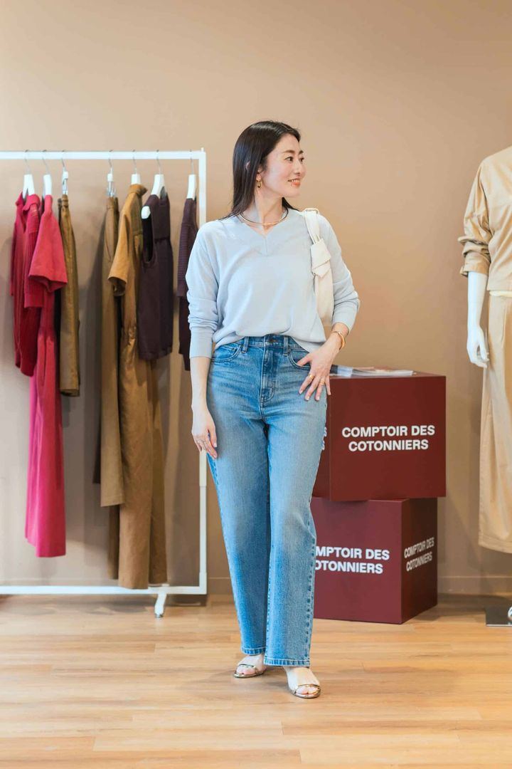「海沿いドライブが気持ちのいい季節到来!鎌倉を散策して海の見えるカフェでランチをするのが、我が家の春の休日の定番コースです。ワンコも一緒のことが多いので、気兼ねなく動けるデニムは欠かせない存在。このデニムは、股上が深めで、細すぎず太すぎないきれいめストレートなので、ラフになりすぎず品良く履けるのも嬉しいポイント。春らしいブルーのニットを合わせて、水色のワントーンで爽やかなコーデに仕上げました」