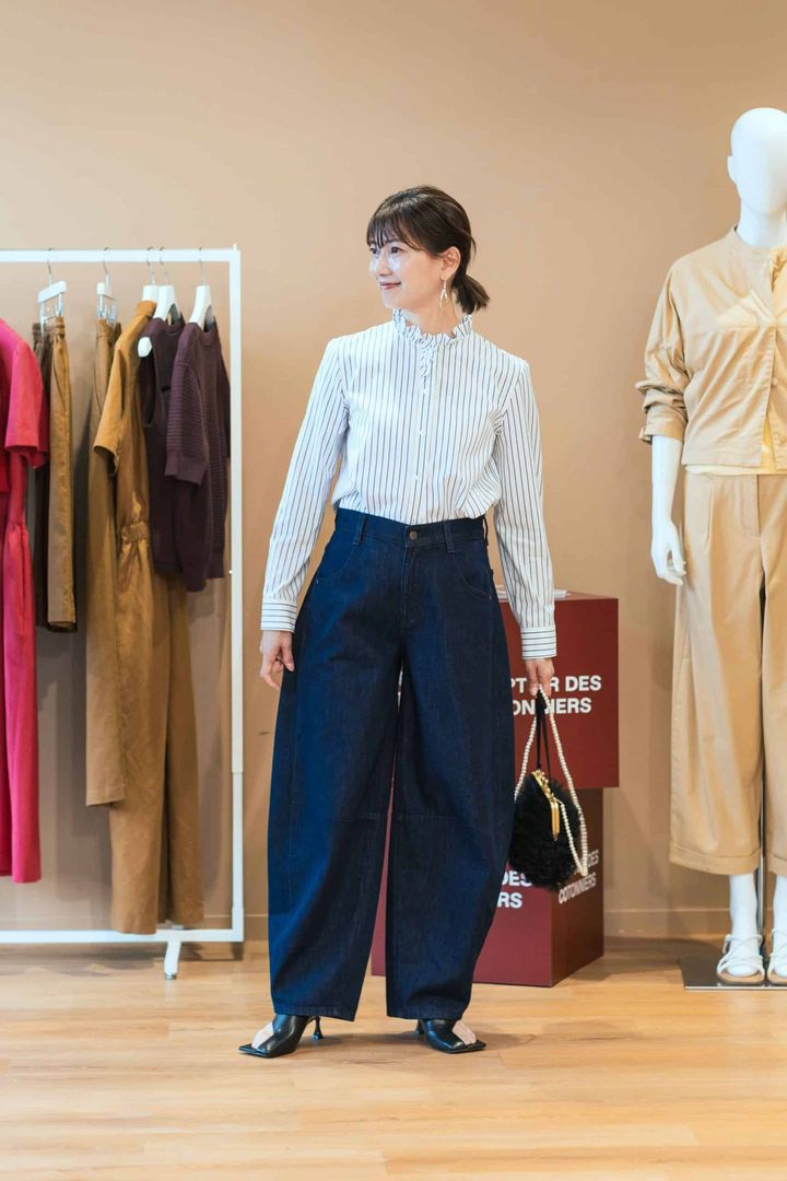 「程よく丸みがある立体的なシルエットが特徴のデニムパンツは、カジュアルになりすぎず女性らしくはけるのも魅力的です。ブルーストライプのコンパクトシャツをインし、ボタンは上まで留めてクラシカルな雰囲気に。首元のフリルでさりげない甘さを効かせるのがポイント。家族との休日ショッピングにぴったりのコーデです」