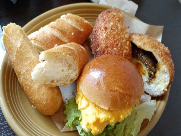 食べやすいようにカットしてもらったので、とっても快適でした。カレーパンの中はほんとに卵が半熟で、辛さも和らげてくれます。そんなに辛くはないんですけどね。 卵まるサンドは、あっためると外はカリッ!中の卵がふわふわで食べ応えがある感じです。 ミルクフランスの少し固めのパンと優しいミルクが相まって口に入れるとこぼれそうになります。しっかりしたミルク味で、クセになります。