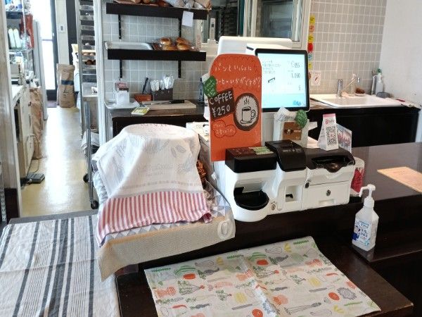 イートインのコーナーは2人席が3席ほどですが、窓から緑が見えて、「ぐりとぐら」の可愛い壁掛けが飾ってあります。 そして、パンの形をした紙ナプキン入れ!知り合いの方の手作りとのことなんですが、ちょっと感動してしまいました。「パン愛」あふれるアイテムです。きっとその方もパン好きなんでしょうね。