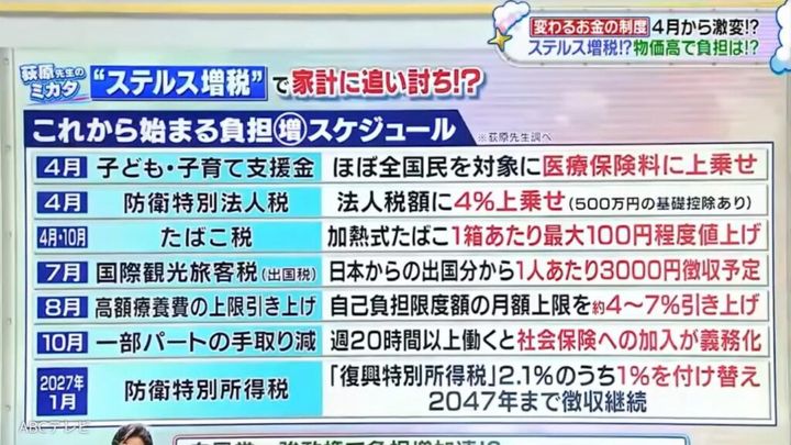 これから始まる国民の負担は、独身税だけではない。4月からは防衛特別法人税、4・10月にはたばこ税、7月には国際観光旅客税(出国税)、8月には高額療養費の上限引き上げ、10月には一部パートの手取り減、翌2027年には防衛特別所得税が国民に待ち構えているのだ。